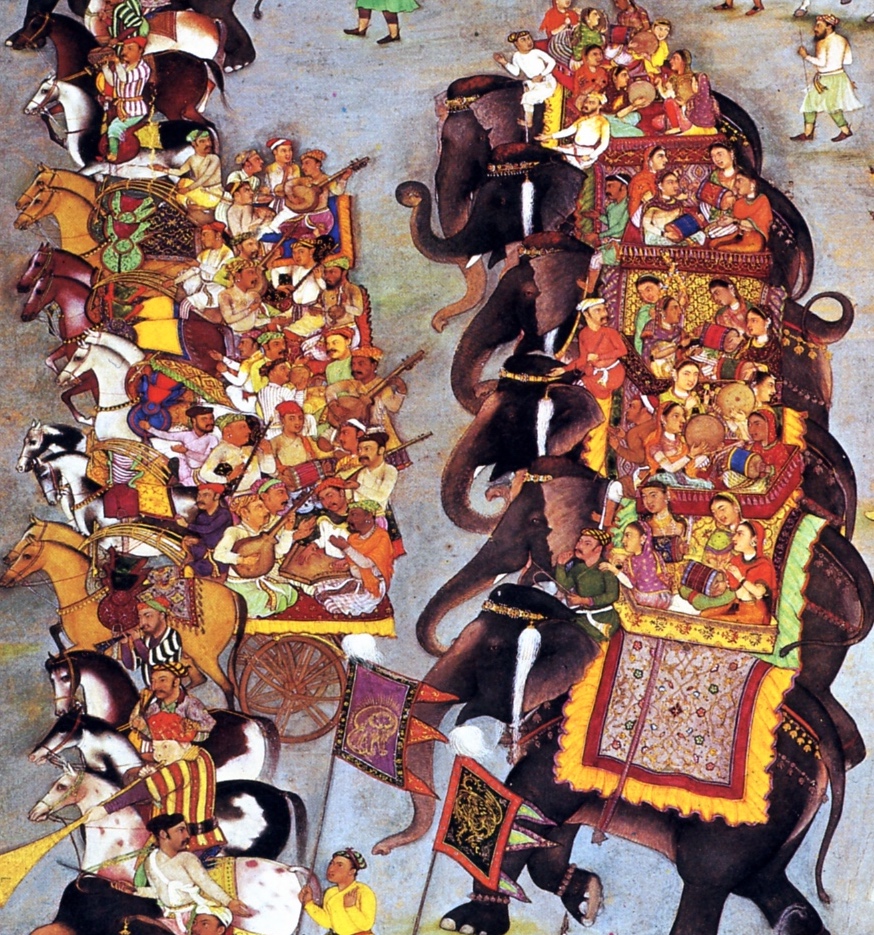 *以下2点とも1740年頃、アワド「ダーラー・シコーの結婚行列」部分/これはダーラー・シコーの結婚の実際の年代より100年ほど経った後世に描かれたものと思われます。ひょっとすると当時のアワド太守は反アウラングゼーブ的人物で、この偉大なしかし反面か弱いダーラー・シコーをその正統性からも崇拝していたのかもしれません。そこでこのような絵を描かせたと考えられなくもありません。従って歴史的にはタブラの存在を詮議する上では必ずしも有効ではないかもしれませんが、描かれてないということの証明にはなると思います。上の部分では象の背に大きなケスが載せられているのが見られます。あの当時はこんな具合に夜も行列が行われ、人々がこんなふうに太鼓を鳴らしてお祝いしたんだ、ということを残したかったと思います。