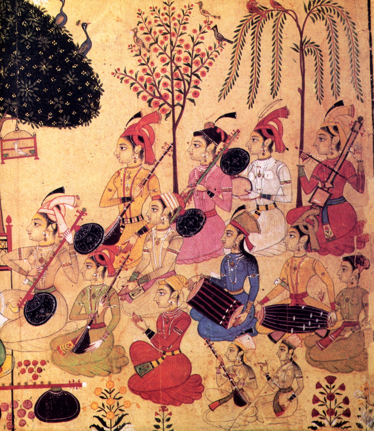 *1633年、ムガール「ダーラー・シコーの結婚祝典」部分/ダーラー・シコーは1615 - 1658年のムガール帝国初期の皇帝になれなかった悲運の王子。象の上の楽師達、打楽器セクション部分、女性達で構成されています。鈴のないタンバリン型の片面太鼓ダフ、小型の両面太鼓ドーラックと思われる皮太鼓が使われています。リアルタイムで描かれたものでしょう。パカワージが使われていないのは祝典的な軽い音楽のため、よりカジュアルな太鼓が使われていると思われます。タブラは見られません。画像をクリックすると前方の馬に乗った弦楽器セクションの様子も見られます。