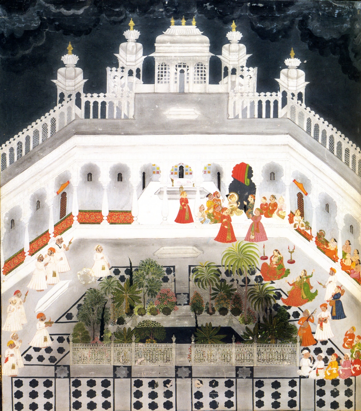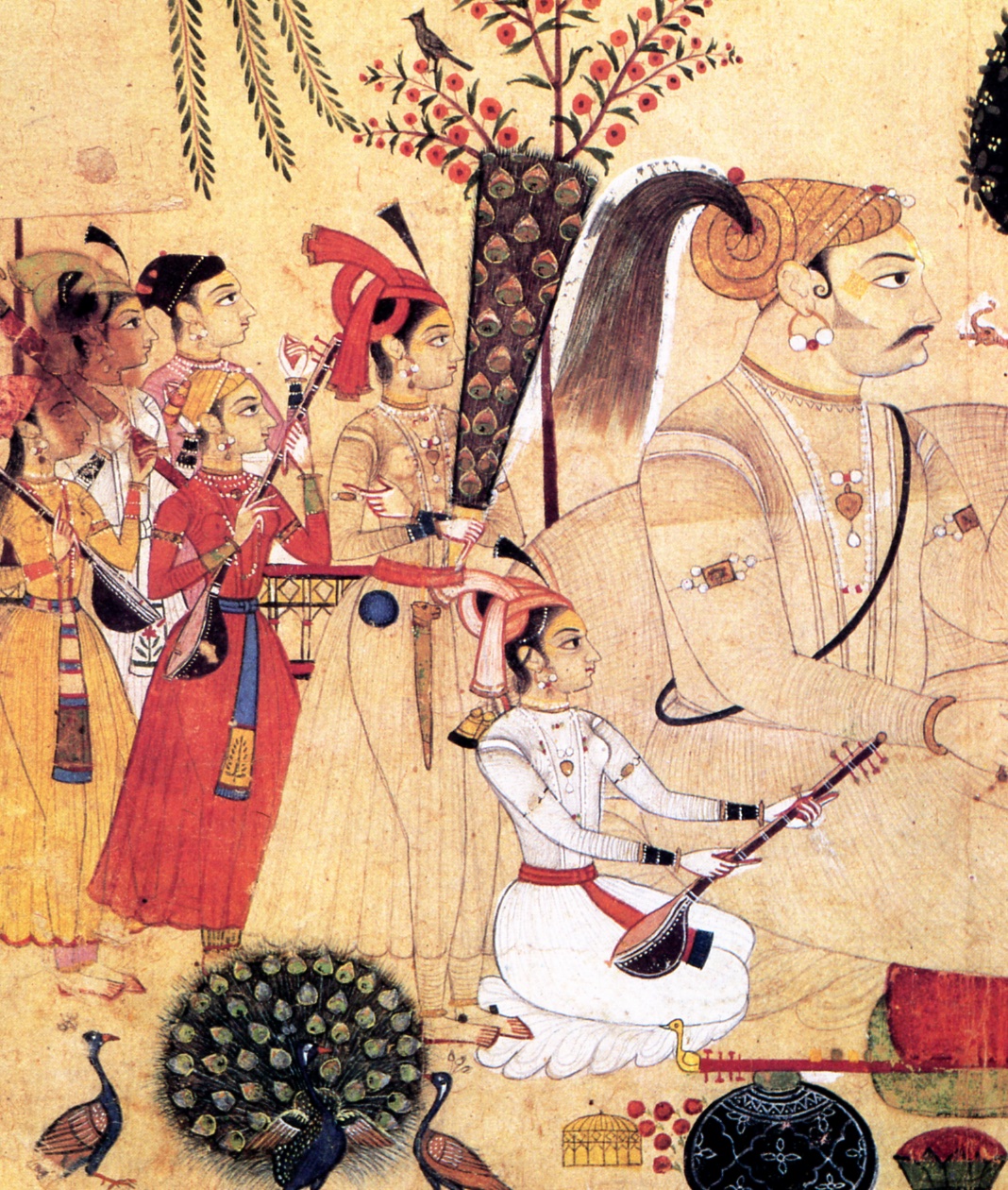 *1690年、ラージプート、ラジュメール「女性楽師達とラージャ・ジャイ・シン」部分/ジャイ・シンはアウラングゼーブの配下、ここに描かれているのは2世と思われます。アウラングゼーブの死後ジャイプル藩王国を創建。ここでもタブラは見られません。
