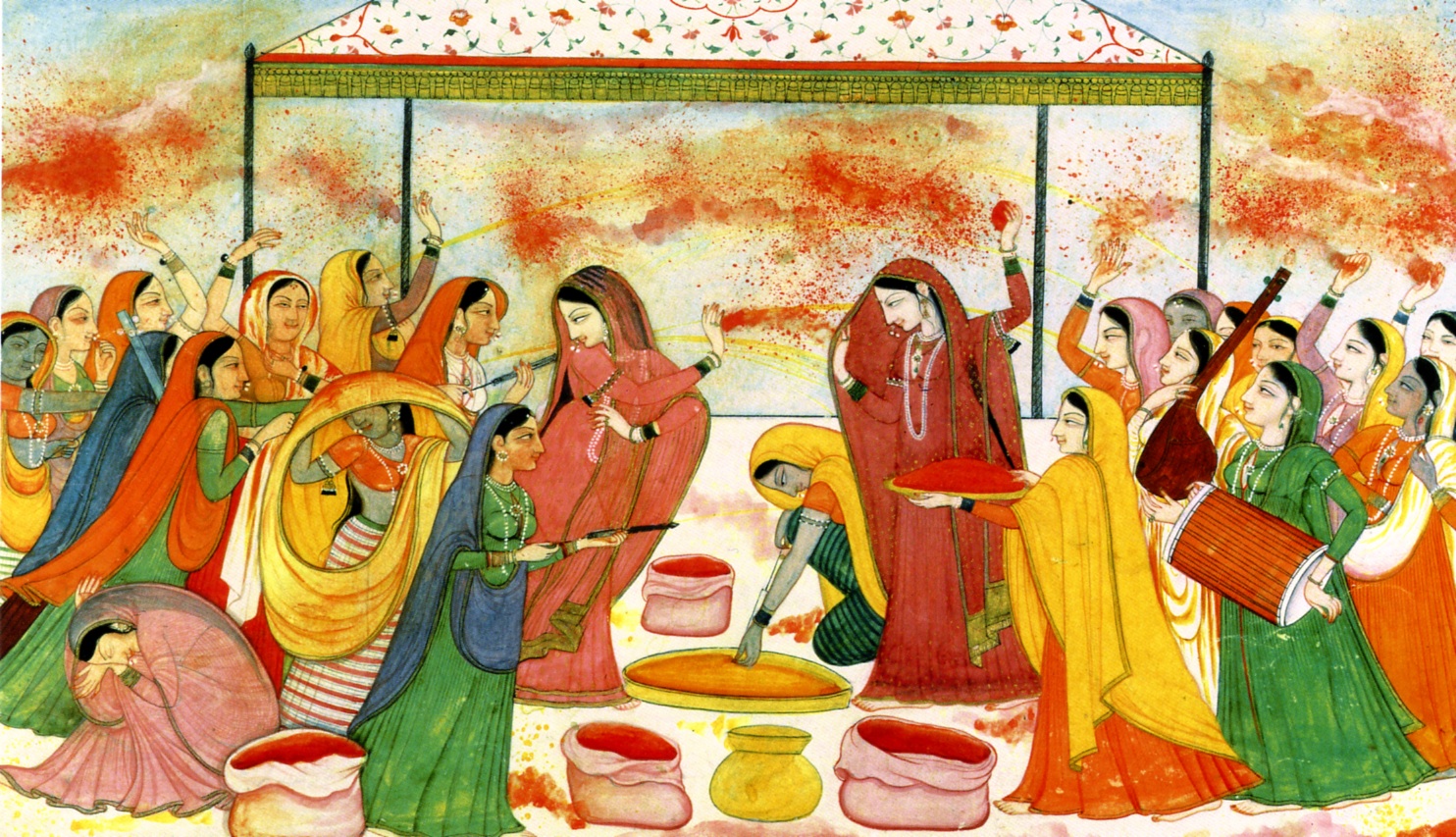 *1788年、カングラ「ホーリー祭」部分/カングラは上のチャンバより少し南の渓谷にある藩王国、大変に美しい土地で、アウラングゼーブ帝に追い出された絵師たちが庇護を求めてこの地にやってきました。そのためその絵は大変高い技術に裏打ちされ、インド美術の最高峰の一つと呼べると思います。日本で言えば京で栄えた狩野派が、江戸幕府が開かれることで探幽達が江戸に移ったようなものでしょうか。いきなり高い文化が花開く訳です。技術だけではなく非常に高い芸術性も見逃せないところですが、ここではやはりホーリー祭が美しい色彩と共に描き出されています。しかしタブラは見当たりません。カングラより北のチャンバにタブラらしきものがあった訳ですから、よりデリーに近いカングラにあっても不思議ではないと言えます。しかし、タブラそのものはデリー発祥というわけではないようなので、なかったから描かなかったということなんでしょう。ここでは同じホーリーでもタブラがない例として挙げてみました。