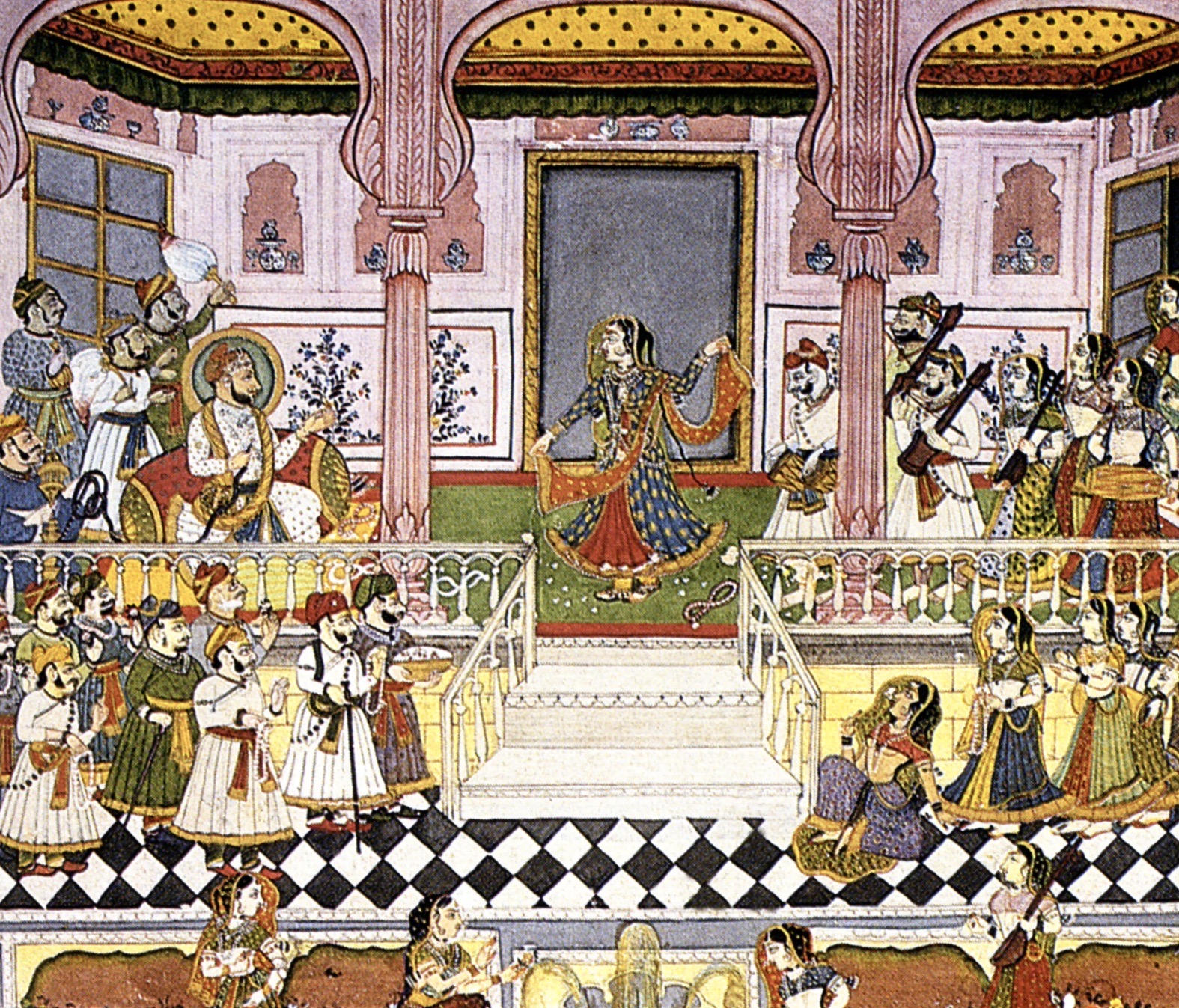 *1700年代終頃、ラジャスタン「宮廷でのダンス」部分/ラジャスタンの方にもタブラは伝わってきました。ラジャスタンの方のミニアチュールには単純化されパターン化されたた人物を輪郭線を強調した表現で描くものがあり、独特の親しみやすさを感じさせます。