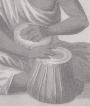 *1755年、ウダイプル「宮廷の中庭での夜宴」部分/メーワール王国(ウダイプル)の湖に浮かぶ美しい白大理石の宮殿、その中庭で繰り広げられた夜の宴、若きラージ・シン2世を楽しませるための歌や踊り。その中についにタブラを見つけ出すことができました。時代背景としてはアウラングゼーブ帝が死んで(1707年)からムガル朝は急速に弱まり、50年もたったこの頃はほとんど有名無実となり、地方の太守や藩王国が有力となっていました。しかし、すぐ近くの1757年にはプラッシーの戦いが始まり東インド会社が勝利し、インドの実権を握っていくこととなります。100年後の1857年セポイの乱と呼ばれたインド大反乱でついにムガル朝は滅びることとなり、1877年にはインド帝国として完全にイギリスの支配下に置かれることとなります。反面各藩同士は牽制し合うことで実戦はなくなり、独自の文化を育てる好機となり、そういう時代の大きな変革期にタブラが登場したということです。この絵でもわかるように、初期においてはあまり大きくはなく、常に立って腰の辺りに括り付けられ、ケスやナッカラとは違ってバチを使わず、今と同じように手や指で打ち鳴らされていたようです。2個一組みという発想はトルコペルシャのものですが、この手指奏法は明らかにインド古来のものと言えるでしょう。それによく見ると既に鼓面の中央部は黒くなっていて、スヤヒ(ガブ)が塗られているのが分かります。この点は重要で、ドーラックやナッカラとは違い、しっかりパカワージの仲間であることが伺えます。